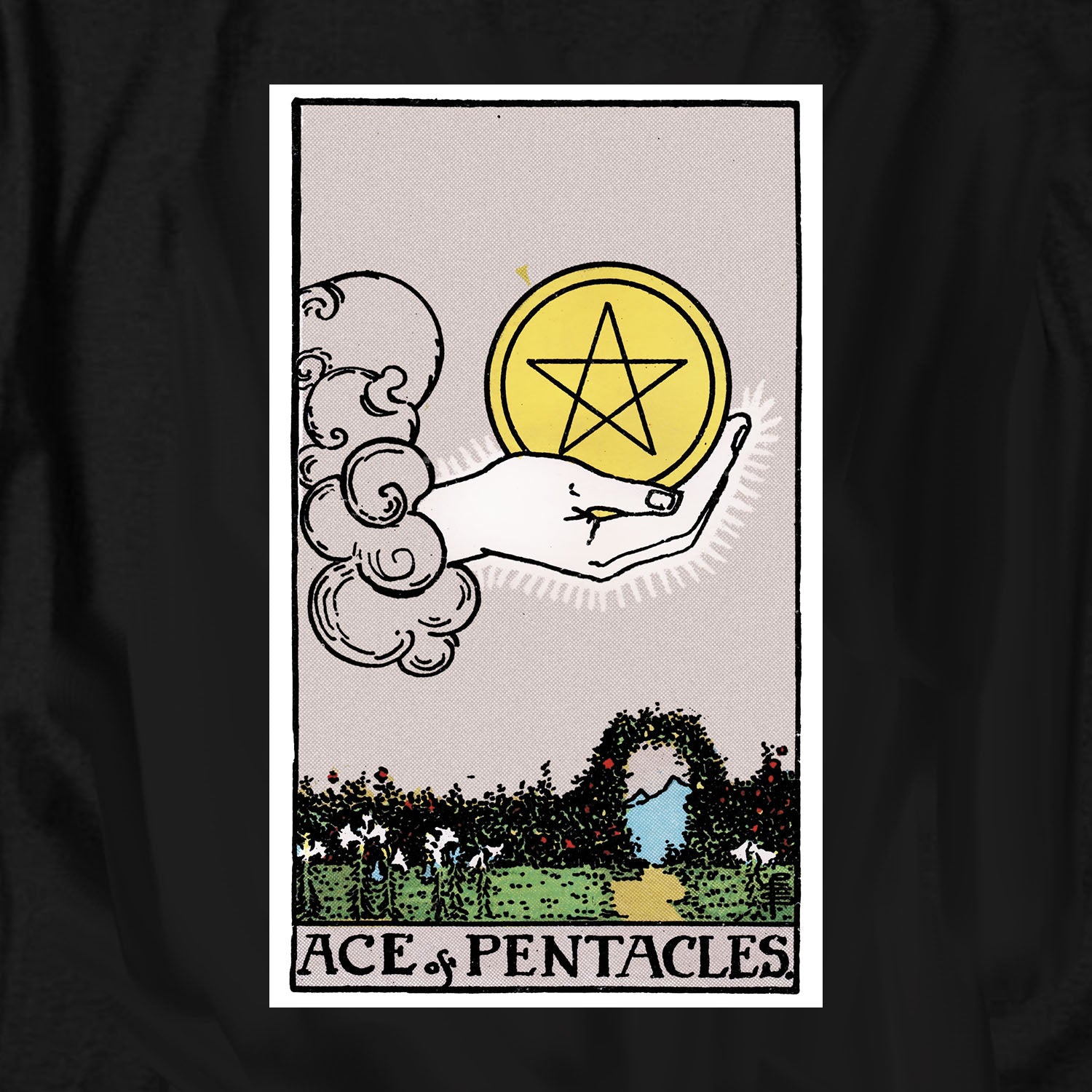 Embrace the energy of prosperity, stability, and new beginnings with the Ace of Pentacles T-Shirt, a beautifully detailed tribute to one of the most auspicious cards in the tarot deck. This striking design captures the imagery from the classic Rider-Waite tarot: a hand emerging from the clouds, offering a radiant golden coin adorned with a pentagram. Beneath it lies a lush garden pathway, lined with blooming flowers, leading toward an archway that opens to distant mountains—symbolizing growth, opportunity, and the journey toward lasting success.