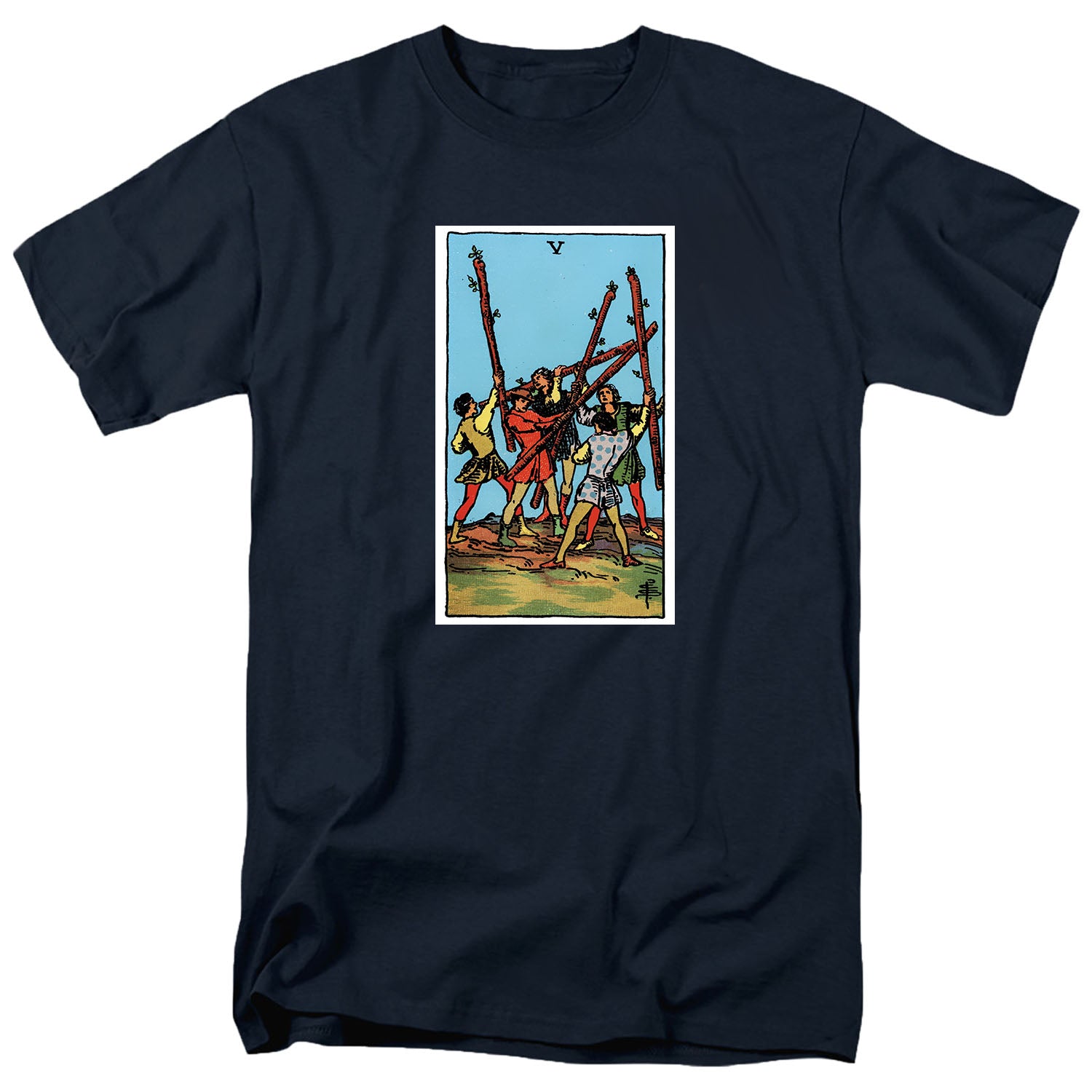 Unleash your inner warrior spirit with the Five of Wands T-Shirt, a bold and symbolic piece inspired by one of the most dynamic and multilayered cards in the tarot. Representing the energy of competition, challenge, and ambition, the Five of Wands is a card that captures the fiery drive to prove oneself and strive for victory. In many tarot decks, this card shows five figures in a spirited clash—whether in real conflict or playful competition—symbolizing the struggle to rise above rivals and claim the top position.
