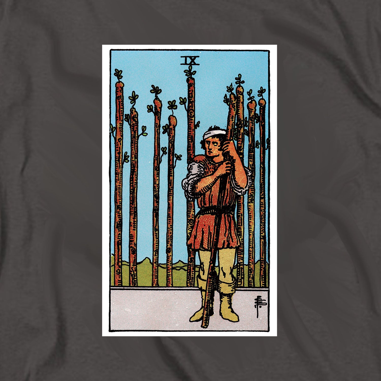 The Nine of Wands T-Shirt is a meaningful and stylish piece designed for those who appreciate the timeless symbolism of Tarot cards. In the Tarot deck, the Nine of Wands is a card of resilience, determination, and standing strong despite past struggles. It often illustrates a figure who, though tired from battles fought, remains steadfast and prepared for whatever comes next. This imagery speaks to perseverance, wisdom gained through experience, and the courage to defend what matters most. Wearing this shirt allows you to carry that same energy with you wherever you go.